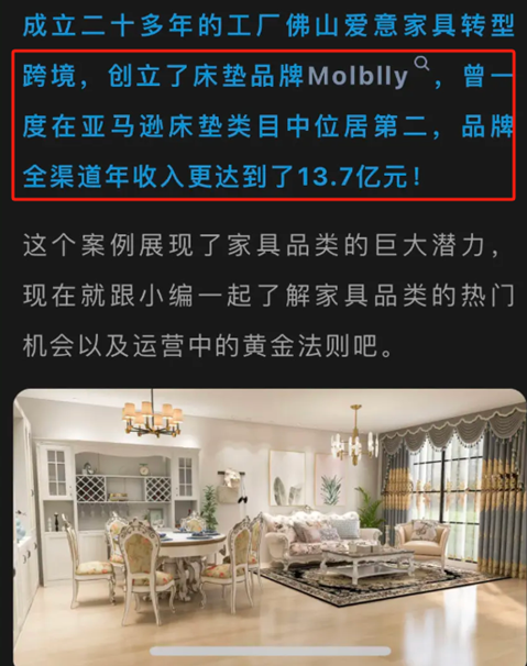 消息一出,便在跨境电商圈子内引起了广泛关注。要知道,虽然爱意跨境2018年才成立,属于跨境电商行业的新秀,但其前身却是一家具有20多年历史的佛山传统代工厂,供应链实力不容小觑。凭借着优质的产品,爱意跨境也迅速在国际市场上崭露头角,数据显示,2019年,爱意跨境仅靠2款商品就拿下了2亿人民币的营业收入。 2022年,爱意跨境扩大产品矩阵,首次推出了自己的床垫出海品牌MOLBLLY,到了2023年4月,该品牌已成功跻身亚马逊床垫类目第二名,去年全年品牌的全渠道收入更是达到了13.7亿元。
