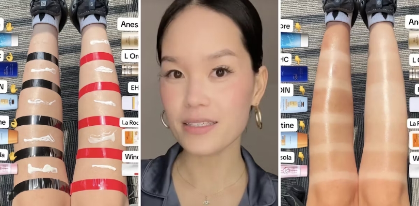 TikTok user @loanvu_uk is a makeup and skincare influencer based in London. She recently posted a slideshow of a sunscreen experiment in which she used 10 products on her legs at the same time. In the caption @loanvu_uk writes, “Sunscreens with the highest UVA UVB protection?”