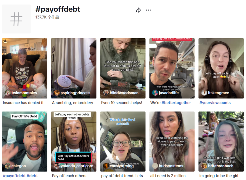 在TikTok上,#payoffdebt标签下已经发布了近14万个视频,创作者们出于各种各样的原因求助,包括医疗账单、学生债务、意外费用,甚至为患癌的小狗筹集医疗费。