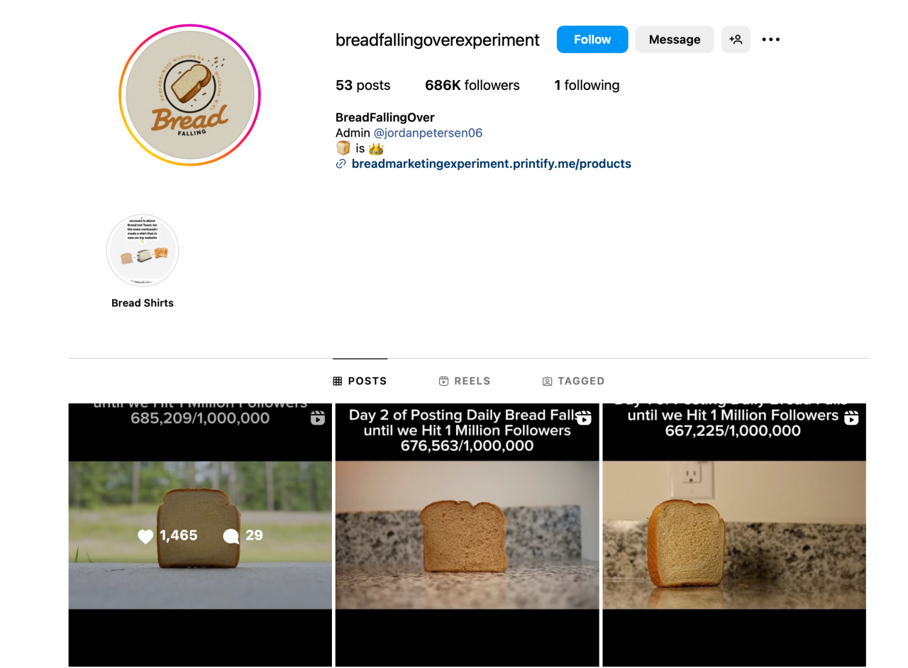 一个显著的例子是Instagram账号“breadfallingoverexperiment”,其内容就是展示面包倒下的视频 (古里奥:对,就是一个站着的面包片倒下了的短视频配两行字),这个账号积累了超过615,000名粉丝。它的成功也进一步证明了这种“帮我证明”营销策略的有效性。
