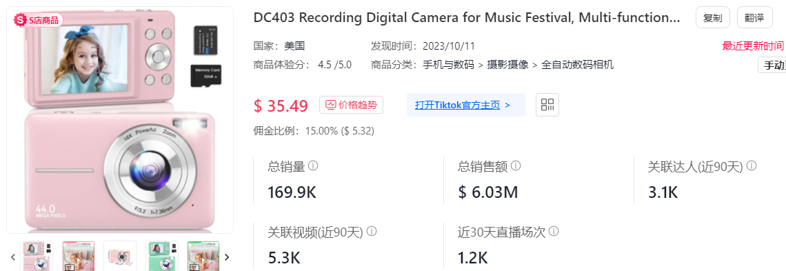 数据显示,该产品的佣金比例为 15%,近 7 天单日销量最高达 1100 件,最低 692 件,关联视频达 277 条,关联直播达 382 场,目前单品总销量 16.99 万件,总销售额达 603 万美元。