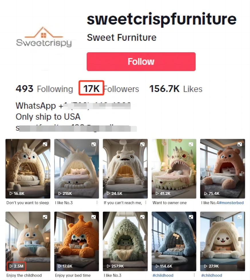 仅短短两个月内,家居类目跨境企业恒健家居便成功将旗下品牌Sweet Furniture,从一个新兴品牌打造成了行业翘楚,成为TikTok Shop美区上家居界的“黑马”。 据悉,恒健家居正是在TikTok Shop的运营指导下有了如今的这份成绩。通过探索及运用TikTok Shop提供的多种丰富玩法,不仅扩展了仓储和产品线,还不断突破业务增长的边界,实现了业务迅速增长。 目前其TikTok账号粉丝数1.7万,获赞数15.67万,单条视频最高播放250万。