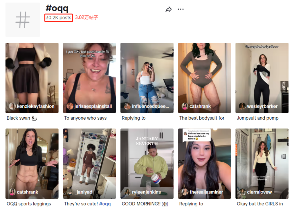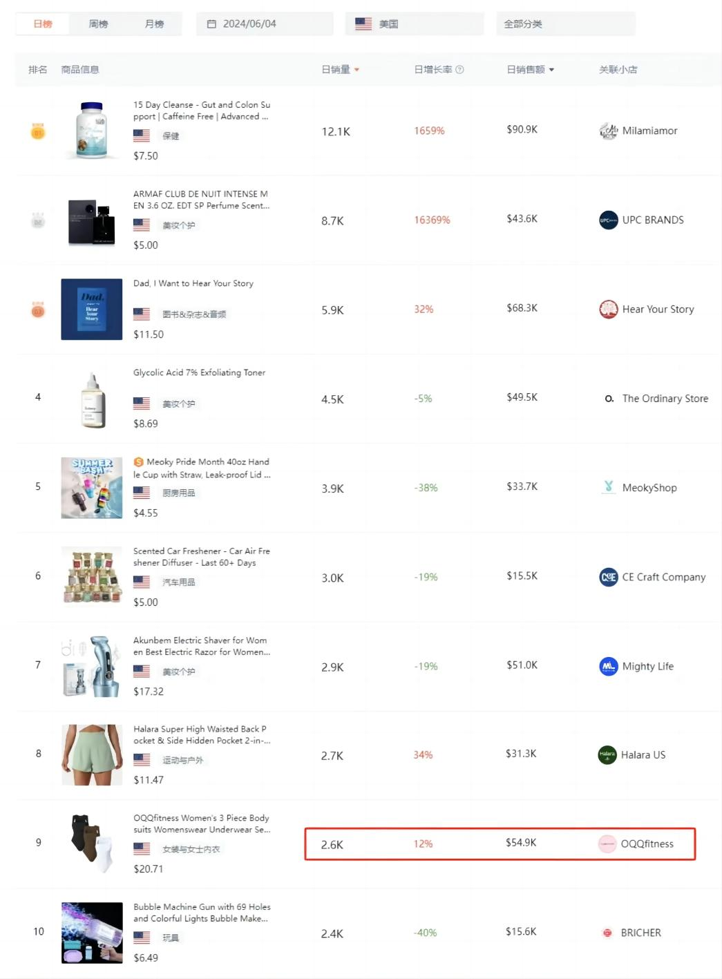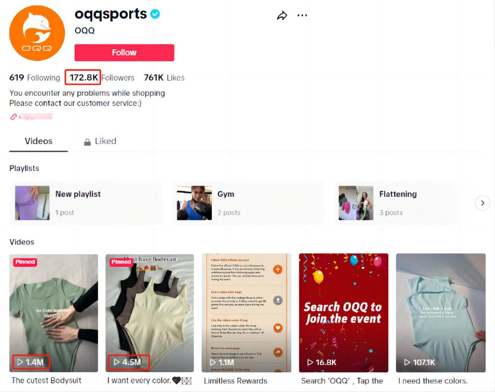 通过与TikTok达人合作以及充分地利用TikTok Shop的资源优势,服装品牌OQQ的品牌标签浏览量猛增至4亿次,销量也实现了倍速增长。 目前其TikTok主账号粉丝数17.28万,获赞数76.1万,单条视频最高播放450万。 至于他们的TikTok小店:OQQfitness,周榜(5.22-6.02)排名第10名,周销量2.62万件,周销售额45.46万美元,折合约329.29万人民币;日榜(6.05)排名第9名,日销量2600件,日销售额1.56万美元,折合约11.30万人民币。