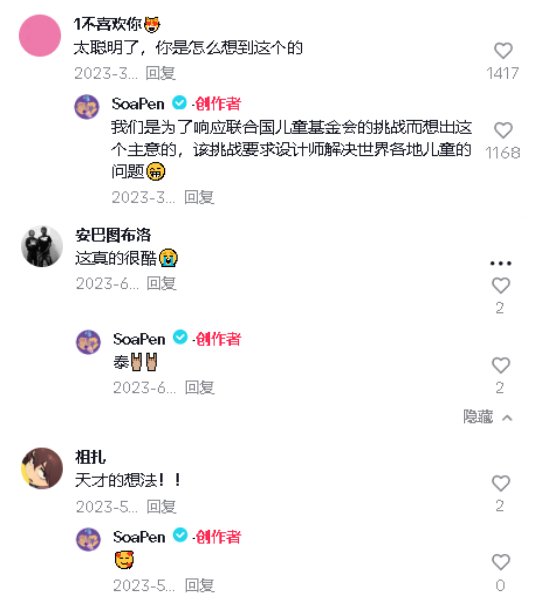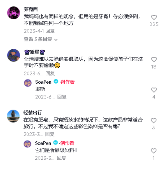 在视频评论区,用户对 Soapen 产品的评价普遍很高,有网友表示认为这个产品非常天才,能够让孩子在洗手时不能偷懒,还有网友认为这个产品和自家妈妈使用牙膏清洁是一个道理,也有网友认可这款产品外出方便携带的优势,对于这些评价,Soapen 账号都会积极响应。通过浏览 Soapen 在评论区的回复,第一次认识到该产品的用户也能直接消除掉一些对于产品的疑惑,从而进一步加深对产品的认知。