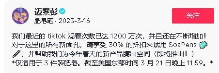 为了给新用户制造福利价惊喜,Soapen 有时还会借着庆祝 TikTok 视频观看量破记录的由头,巧妙地为新用户提供产品折扣,刺激他们的购买欲望。在官方账号营销的同时,Soapen 也会与 TikTok 上与产品属性相匹配的 KOL 进行合作,借助达人的圈层影响力实现用户的高效触达。