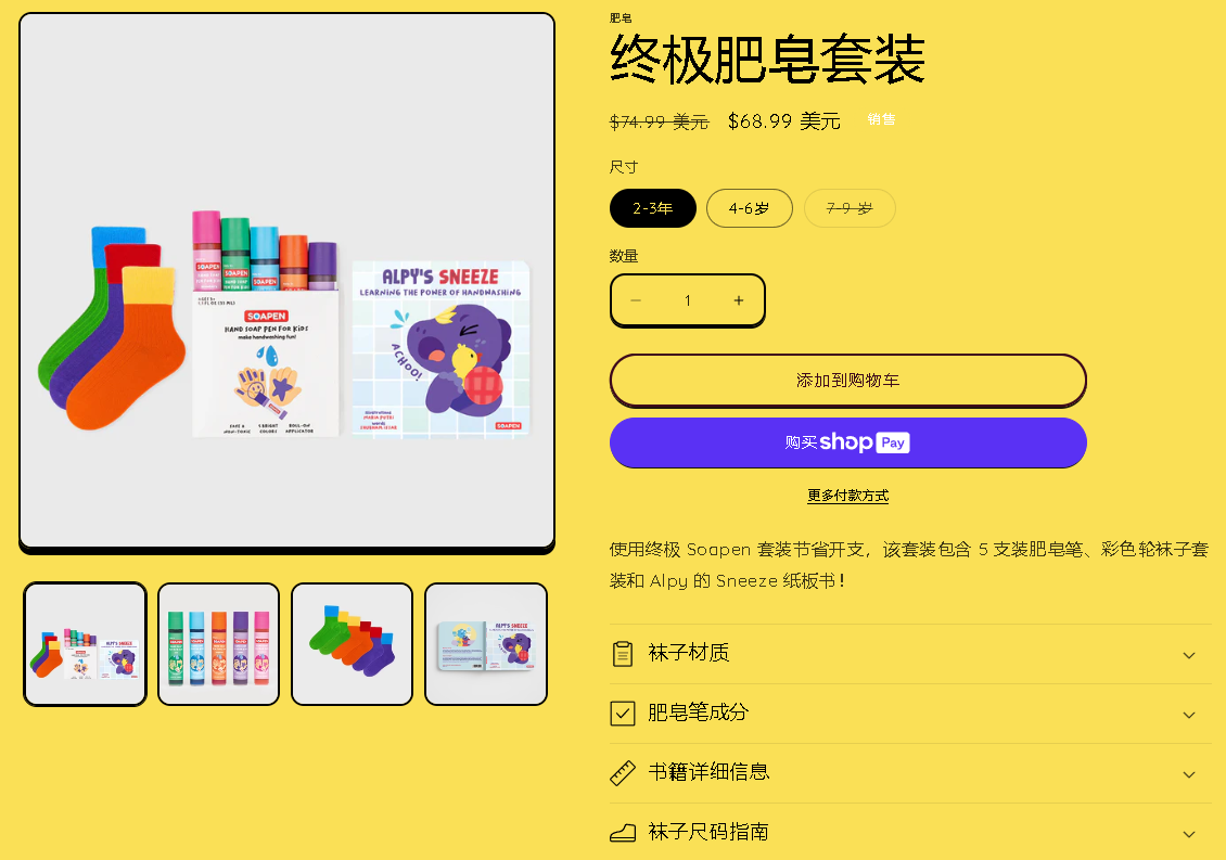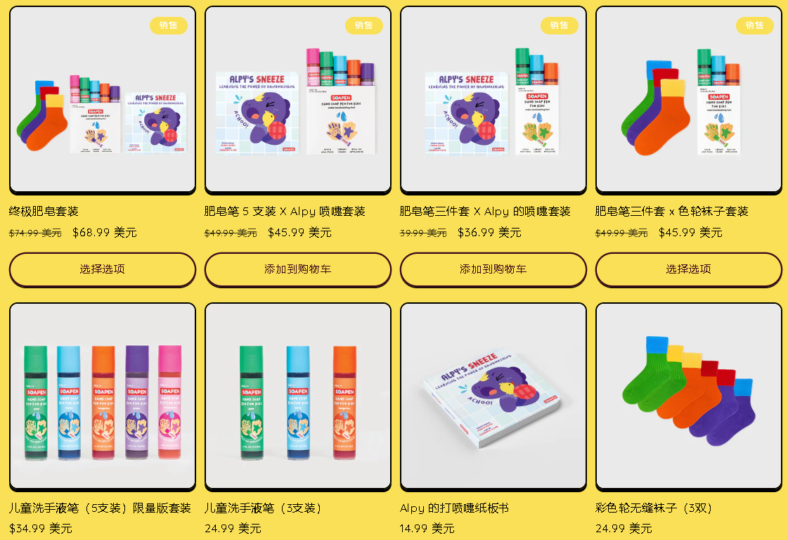 随着品牌影响力的不断扩大,2023 年Soapen 通过收集消费者反馈改进了产品配方,让图案的清洗更轻松,洗手的泡沫体验更丰富。此外,Soapen 还将葡萄香味紫色和草莓香味粉色这两种新颜色加入到现有的颜色系列中,并出版了一本以恐龙 Alpy 为主角的新儿童读物,结合恐龙 Alpy 在城市和大自然之间进行有趣的冒险,教会孩子正确洗手的重要性以及洗手的步骤。 目前,消费者可以在官网以 24.99 美元的价格购买 Soapen 三件装,以 34.99 美元的价格购买 Soapen 三件装,以 24.99 美元的价格购买三件装的无缝袜子,以 14.99 美元的价格购买 Alpy 的喷嚏纸板书,或者以 68.99 美元的价格购买肥皂、袜子和喷嚏纸板书的组合套装。