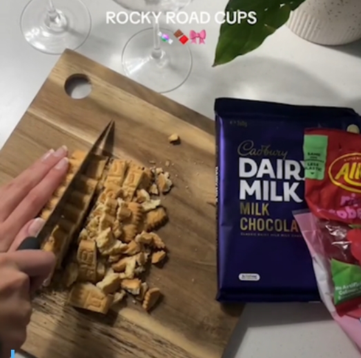 The recipe involves cutting up the typical rocky road ingredients as you usually would –think mini marshmallows, chopped biscuits, raspberry lollies, chopped Maltesers.