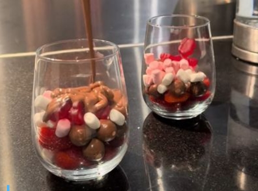 The video shows her quickly whipping up two 'rocky road cups' with fresh strawberries, Maltesers, marshmallows and mini red frogs topped with melted milk chocolate.