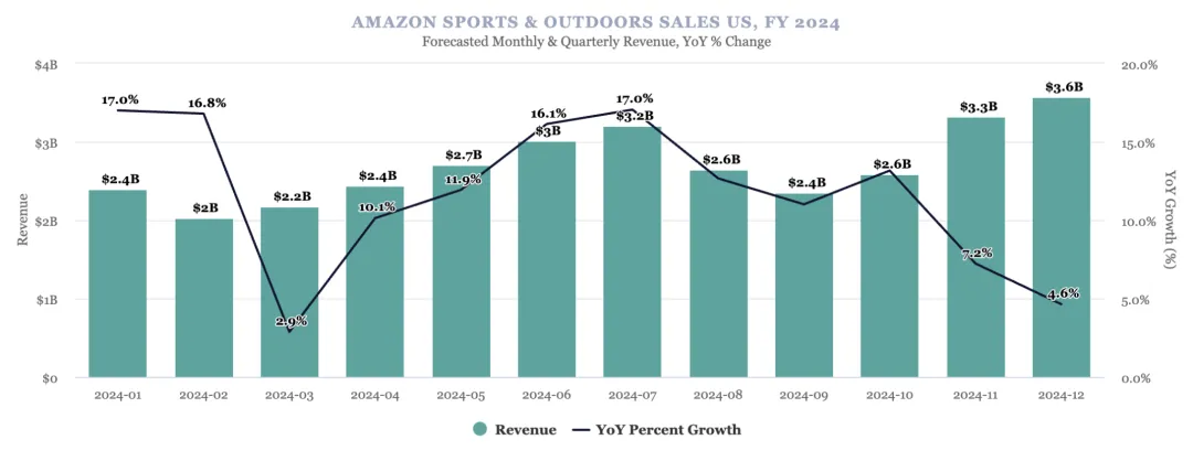 事实上近年来,随着人们健康意识的提升,越来越多的人热衷于通过户外运动来追求自我疗愈,徒步、骑行、露营、爬山等户外运动也逐渐从小众变得大众,由此推动了户外运动消费市场的蓬勃发展。 数据显示,早在2021年,全球运动及户外类目的线上销售额就达到了惊人的1793亿美金。预计在2021年—2025年期间,这一市场的规模会以6.86%的复合年增长率不断扩大,并在2025年达到2343亿美金。之后,全球户外运动电商市场的规模还会继续增长。 一份来自Momentum Commerce的研究也表明户外运动消费市场大有增长潜力。根据该机构公布的数据,2024年,亚马逊美国站户外运动类产品的销售额预计将会达到324亿美元,同比增长11.4%。在今年一些主要的促销节点中,该品类的销售额预计将会暴涨。