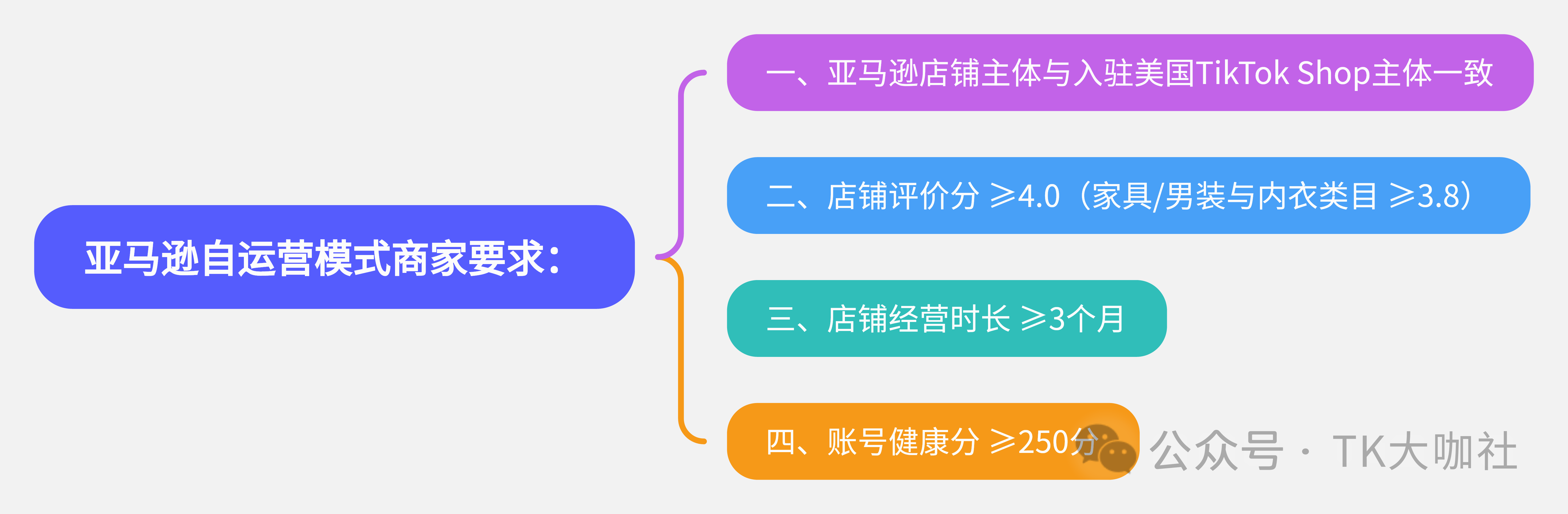 1、亚马逊店铺主体与入驻美国TikTok Shop主体一致, 2、店铺评价分 ≥4.0(家具/男装与内衣类目 ≥3.8), 3、店铺经营时长 ≥3个月, 4、账号健康分 ≥250分。