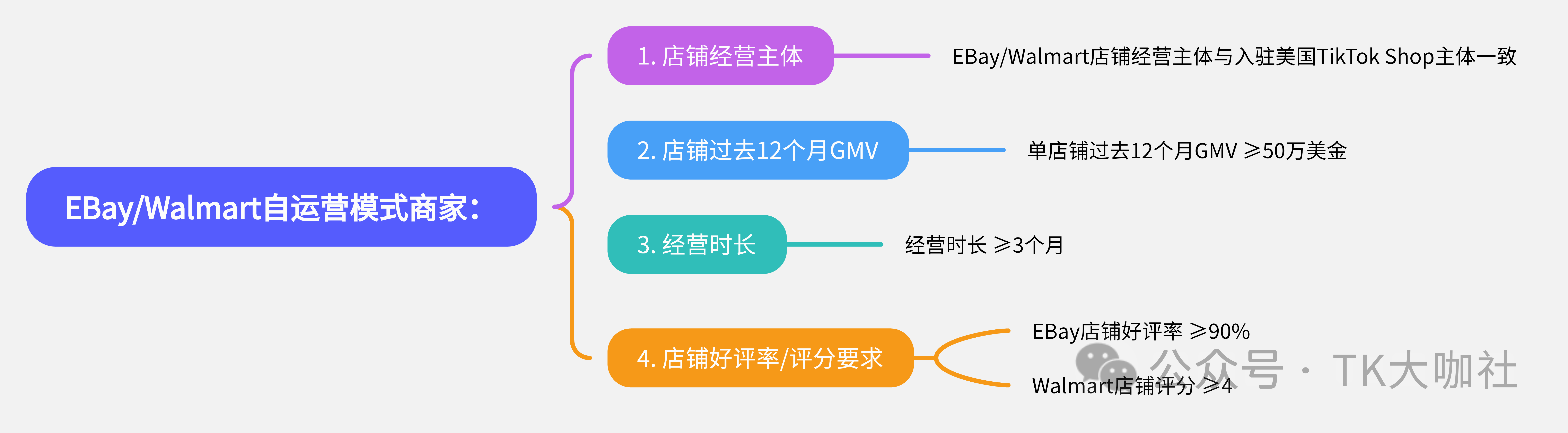 1、EBay/Walmart店铺经营主体与入驻美国TikTok Shop主体一致, 2、单店铺过去12个月GMV ≥50万美金, 3、经营时长 ≥3个月, 4、店铺好评率/评分要求: 1)EBay店铺好评率 ≥90%; 2)Walmart店铺评分 ≥4。