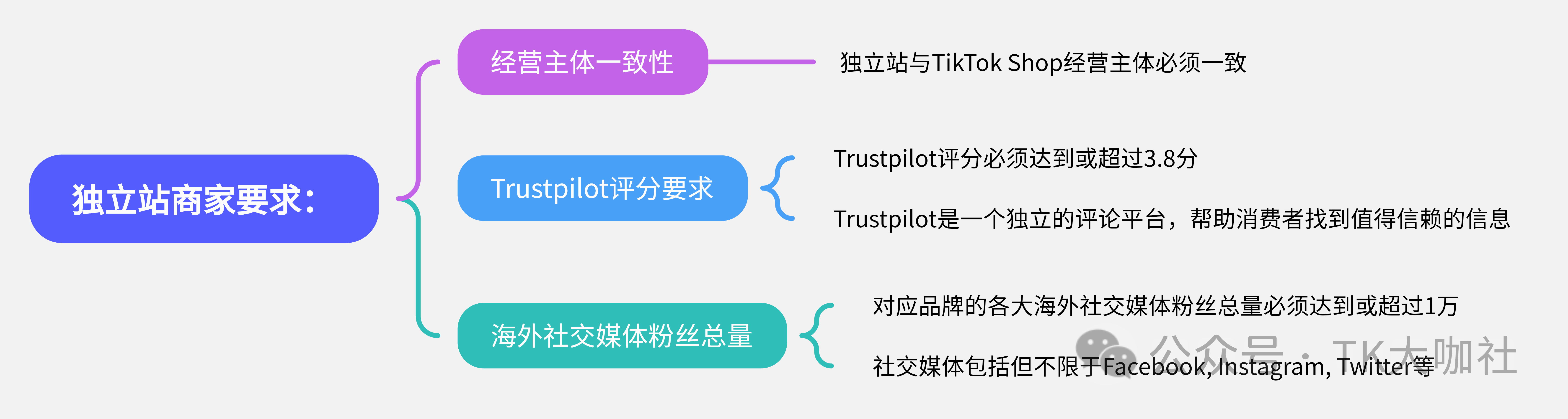 1、独立站经营主体与入驻美国TikTok Shop主体一致, 2、Trustpilot评分 ≥3.8分, 备注:Trustpilot是一个独立的评论平台,旨在帮助消费者找到值得信赖的信息,使他们能够放心购买。 3、对应品牌的各大海外社交媒体粉丝总量 ≥1万。