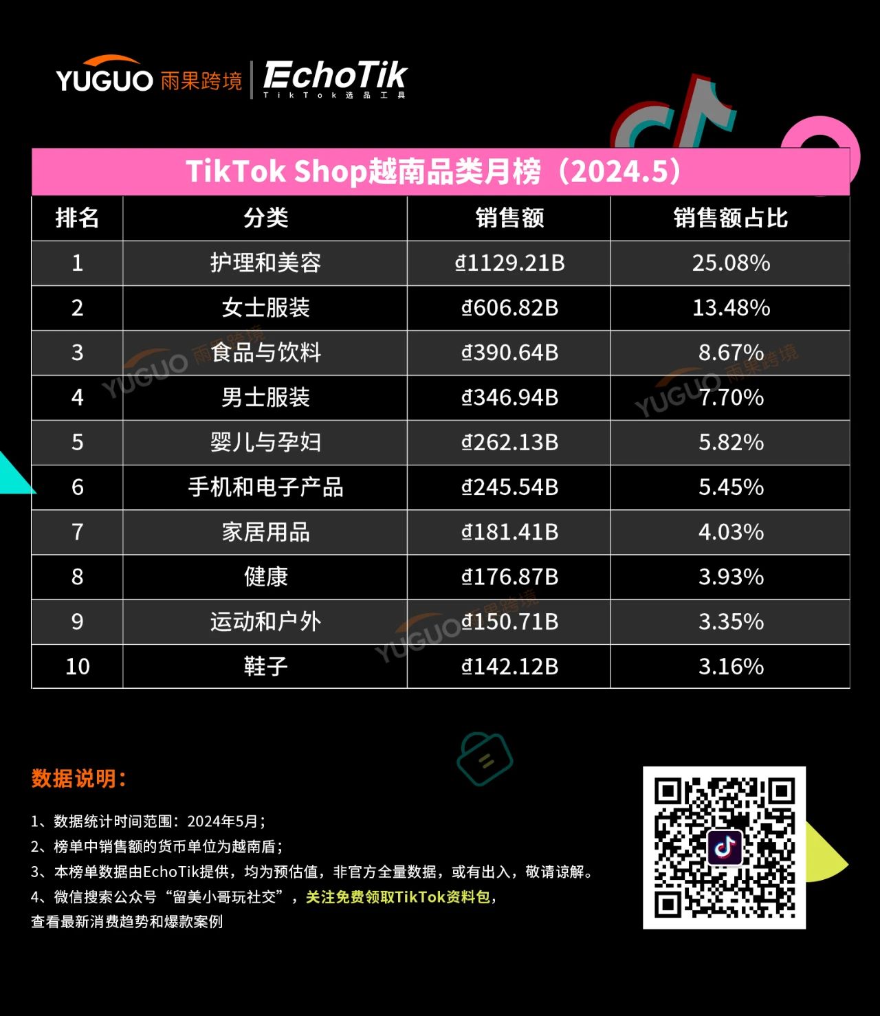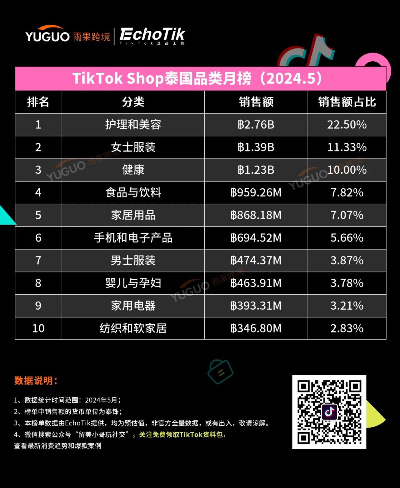 根据 Echotik 数据显示,2024 年 5 月,TikTok Shop 泰国市场热销品类的前三位分别为“护理美容、“女士服装”、“健康”,合计占比为 43.83%。