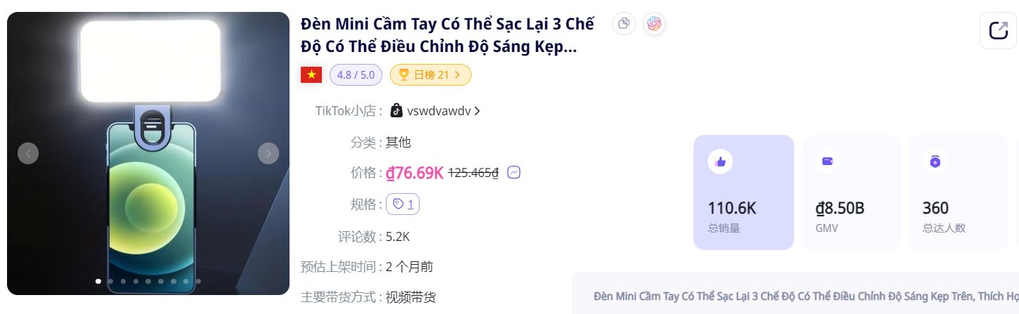 另外店铺内的明星爆品就是上文提到的““迷你便携式充电自拍灯”,该单品月 GMV 高达 5.91B 越南盾,可以说仅凭一件单品的销量登上本期 TOP 榜单。