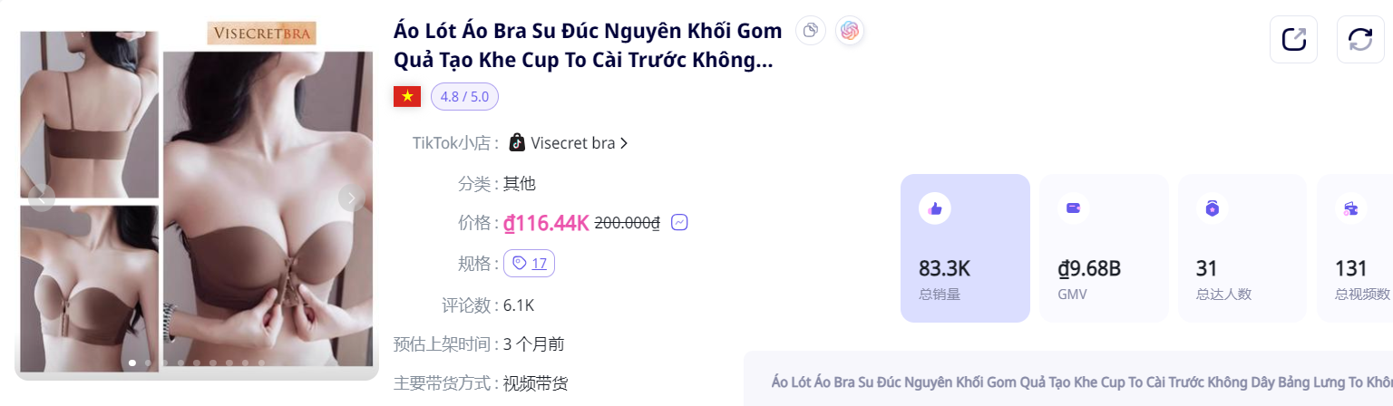 另一款售价 116.19K 越南盾的“实心无钢圈接缝模压文胸”也值得卖家关注,该商品出货量达 6.74 万件,主要带货方式为视频带货。