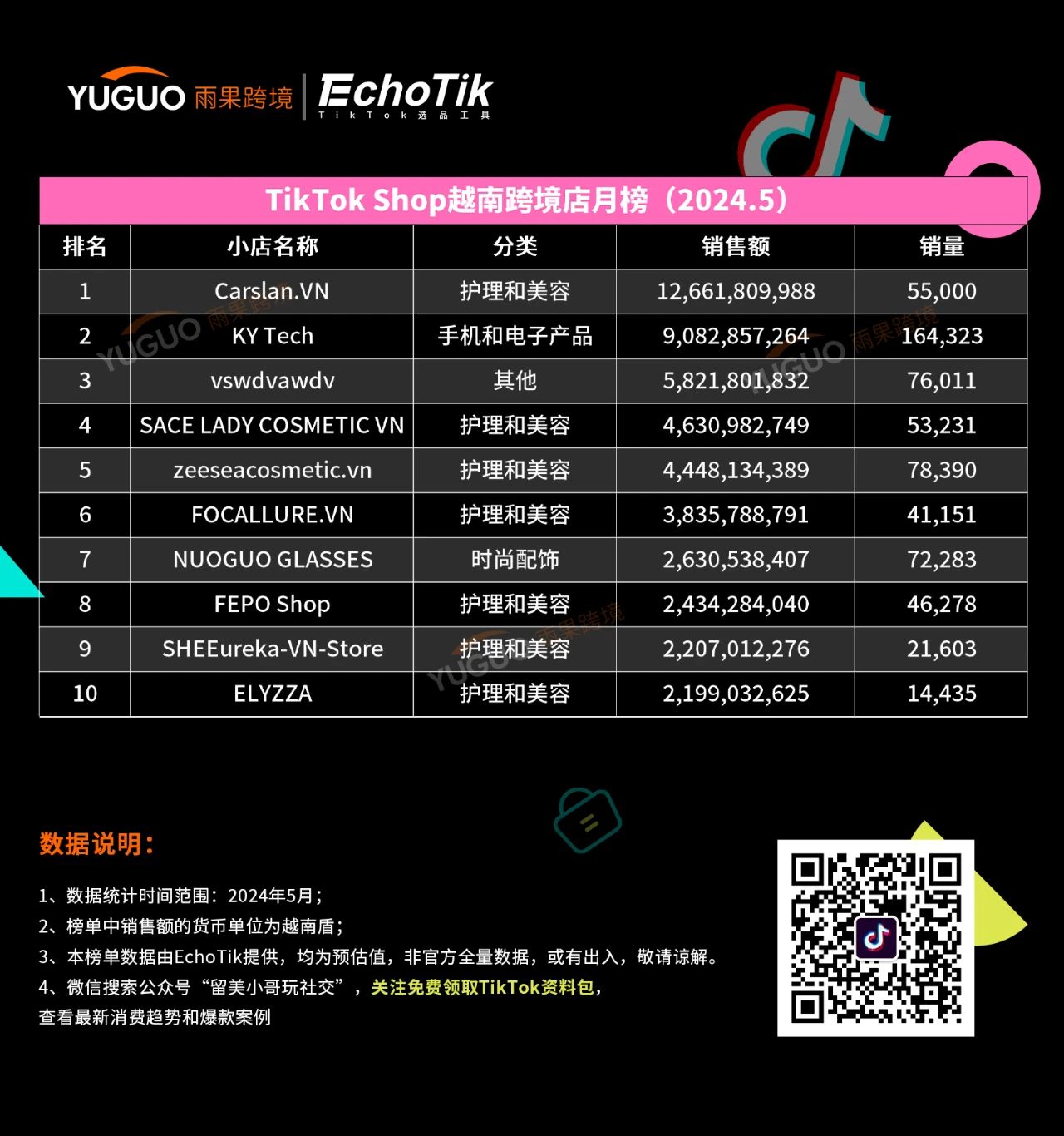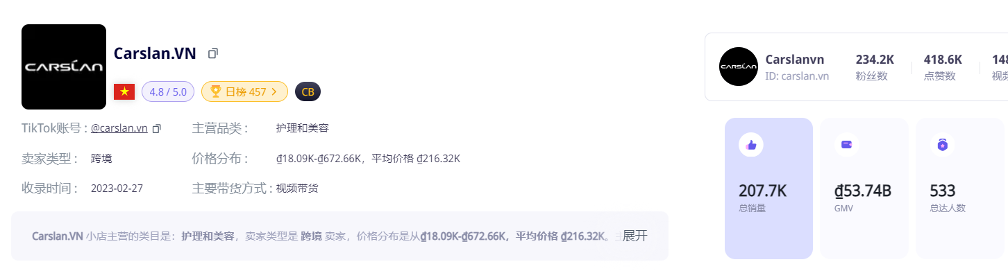 榜单排名第一的跨境小店 @Carslan.VN 主营“护理美容”类目,主要带货模式为视频带货,月销售额约达 12.6B 越南盾,销量 55K。