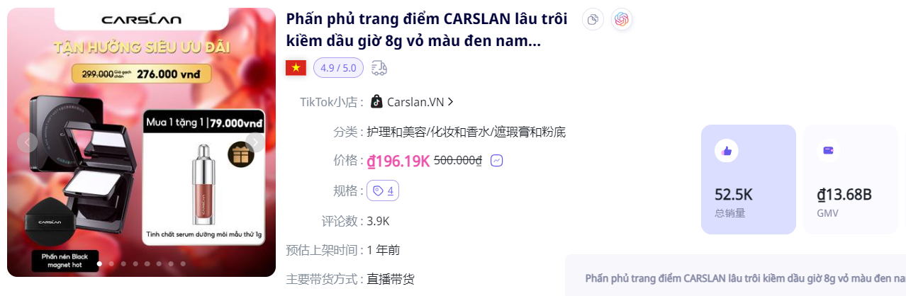 店铺销量最好的是一款售价 196.19K 越南盾的“控油定妆粉”,带货模式为直播带货,当前累计售出 1.64 万件,单品月 GMV 达 3.67B 越南盾。