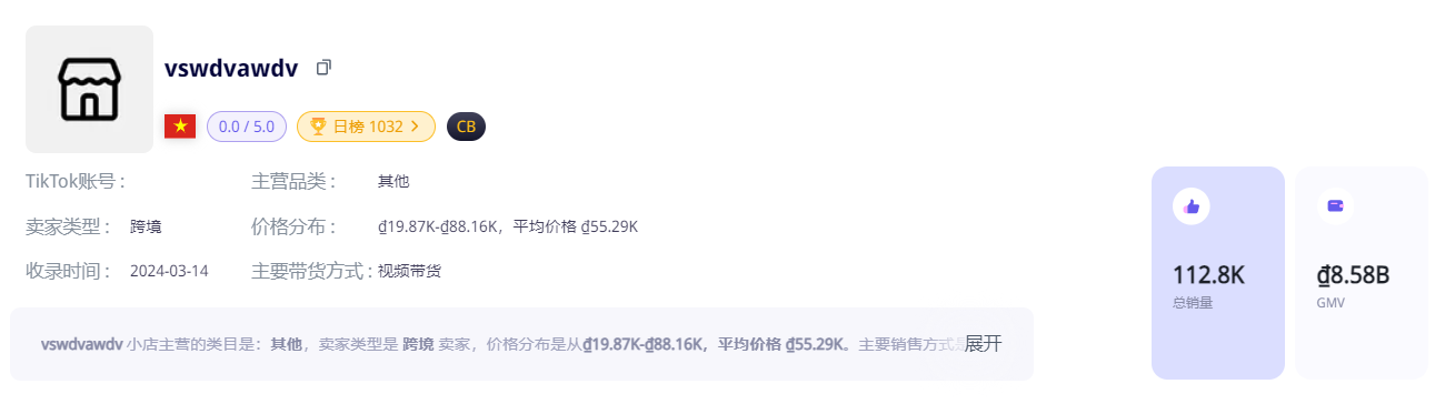 新上榜潜力店铺是排在第三位的小店 @vswdvawdv ,主营“手机数码 ”类目,主要带货模式为视频带货,月销售额达 5.8B 越南盾,销量 76K。