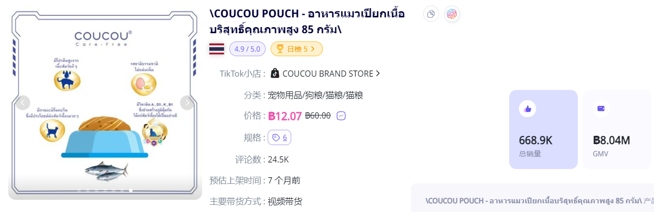 根据商品热度变动情况,近 30 天里,一款售价 12.07 泰铢的“高品质纯牛肉湿猫粮”销量最高,商品出货量达 19.19 万件,主要带货方式为视频带货。