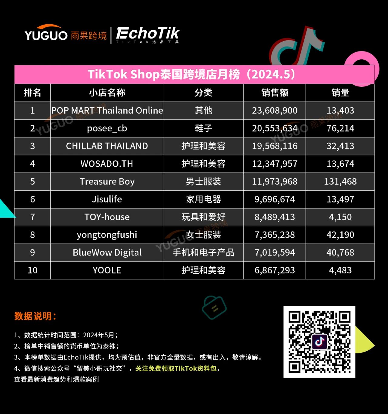 榜单排名第一的跨境小店 @POP MART Thailand Online 主营“其他”类目,主要带货模式为视频带货,月销售额约达 27.2M 泰铢,销量 14.9K。