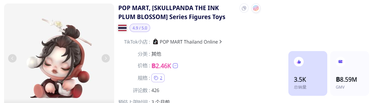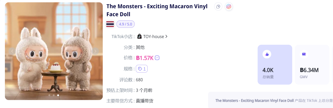 近 30 天内,店铺销量最好的是一款售价 1.57K 泰铢的“Popmart 怪物玩偶盲盒”,带货模式为直播带货,当前累计售出 4000 件,单品月 GMV 达 173.2K 泰铢。