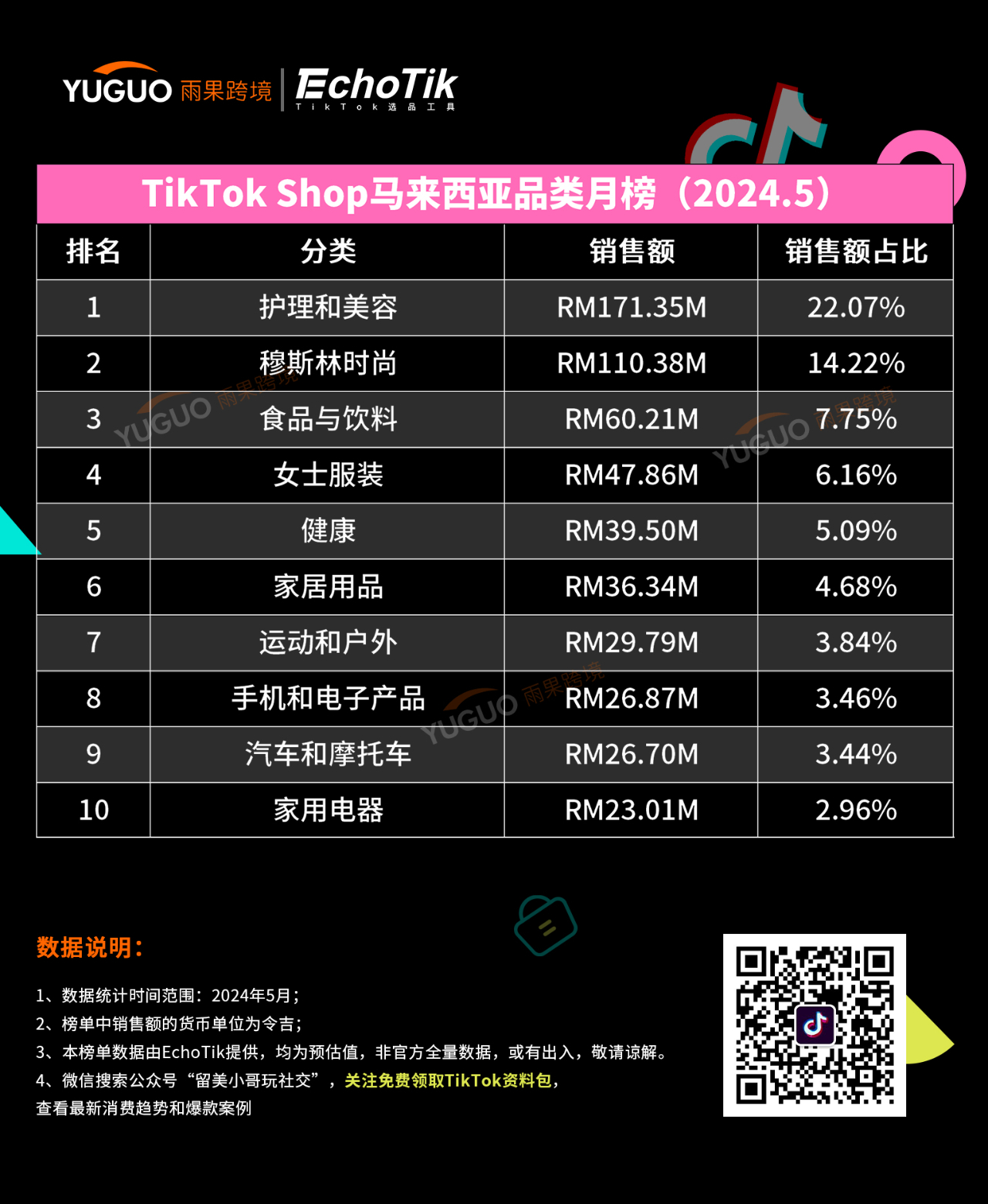 根据 Echotik 数据显示,2024 年 5 月,TikTok Shop 马来西亚市场热销品类的前三位分别为“护理美容、“穆斯林时尚”、“食品饮料”,合计占比为 44.04%。