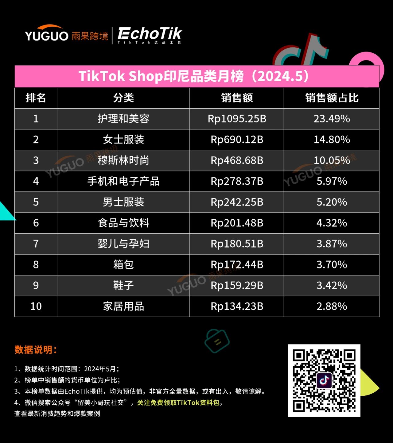 根据 Echotik 数据显示,2024 年 5 月,TikTok Shop 印尼市场热销品类的前三位分别为“护理美容、“女士服装”、“穆斯林时尚”,合计占比为 48.34%。