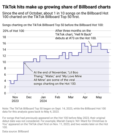 Until it was acquired by a Chinese tech company in 2018, TikTok operated as a lip-synching video platform called Musical.ly. But even after switching names and changing its primary function, TikTok kept the spirit of its musical roots, growing exponentially and shaping the music landscape with it. In September 2023, the social platform and Billboard announced the launch of the official TikTok Billboard Top 50, a weekly chart comprising the most popular songs on the app. It's no surprise to Gen Zers that TikTok's top-performing songs often cross over into the mainstream rankings. Since the chart's debut on Sept. 14, 2023, popular TikTok songs have quickly claimed a growing share of the Hot 100 over the last six months. By April, nearly 1 in 6 songs (including Cardi B's "Enough (Miami)," Jack Harlow's "Lovin on Me," and, more recently, Dasha's "Austin") was charting on the Hot 100 after debuting on the TikTok Top 50 first. Artists have increasingly utilized this momentous strategy, debuting songs on TikTok in the hope that they will leak onto the main Billboard charts. Some of these songs have risen organically through the app, but the music industry is now playing the game too. Marketers have targeted TikTok, hiring influencers to amplify songs and promote user-generated content from fans. The social platform is also working with artists and labels to keep revenue coming in, building out its own music streaming service, TikTok Music, and organizing live, in-person concerts, the first of which took place in Arizona in December 2023 and featured popular TikTok artists such as Cardi B and Charlie Puth. What's different about TikTok music is the level of interaction from its users. In a May 2022 NPR interview, analyst Tatiana Cirisano compiled consumer behavior data and found that TikTok users were more likely to spend money on music, citing that "40% of active TikTok users pay a monthly subscription for music, compared to 25% of the general population." They're even more likely to buy an artist's merchandise. Nowadays, artists have to spend just as much time making music as they do cultivating an online presence.