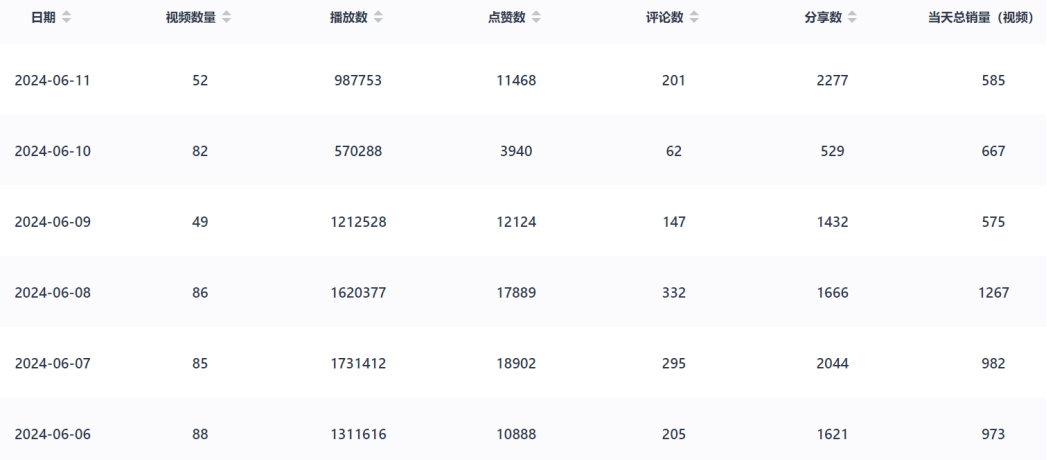 比如,在6月11日这一天,有52个相关视频在播放,播放量达到了98万以上,但当天的总销量为585件而已。另外,从直播带货角度来看,Etekcity这款产品的转化率其实也不算高,平均转化率仅为0.02%-0.38%之间。