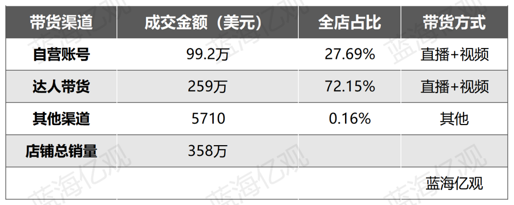 我们从整个店铺的成交渠道数据,也能发现这一特点。 在各成交渠道中,Etekcity自营账号的“直播+视频”的带货金额仅为99.2万美元左右,占比为27.69%,而其余的73%左右的销售收入,均来自达人的“直播+视频”。