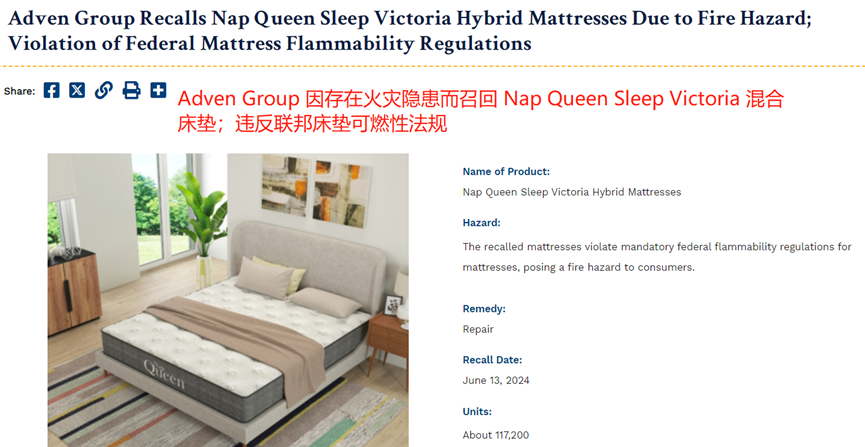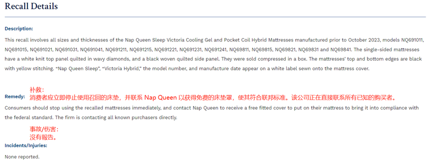 具体来看,这款产品的顶板缝有白色波浪菱形图案,侧板、顶部和底部边缘颜色为黑色,缝有黄色缝线,床垫套的白色标签上则印有“Nap Queen Sleep”、“Victoria Hybrid”、型号和制造日期。它从2020年2月开始在亚马逊、沃尔玛、家得宝等各大主流电商平台上出售,售价在160美元—375美元之间,截止到2023年10月,已经售出了超过11万件。 对于召回该产品的理由,CPSC做出了解释,那就是它违反了联邦强制性床垫可燃性法规,有可能会导致火灾,进而造成消费者伤亡。尽管目前该产品还未收到事故报告,但CPSC认为它存在巨大风险,因此还是决定召回所有在2023年10月之前生产的这款产品。 另外,CPSC提醒消费者,一旦购买到此款产品,应当立即停止使用,并联系Nap Queen公司以获得赔偿。目前,该公司也正在联系所有已知的购买者。