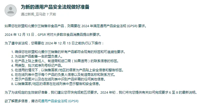 客观来看,由于不同国家的监管标准差异和卖家追求利润最大化的行为,跨境电商市场确实存在着大量质量不合格的产品。它们势必会侵害到消费者的权益,进而损伤平台与卖家的信誉。为了规范行业,许多国家政府和电商平台都收紧了监管。 今年一开年,大批亚马逊卖家就收到了平台的提醒:欧洲《通用产品安全法规》(GPSR)将于当地时间2024年12月13日起正式实施,卖家应当提前做好准备,自觉按照新法规完成合规要求。