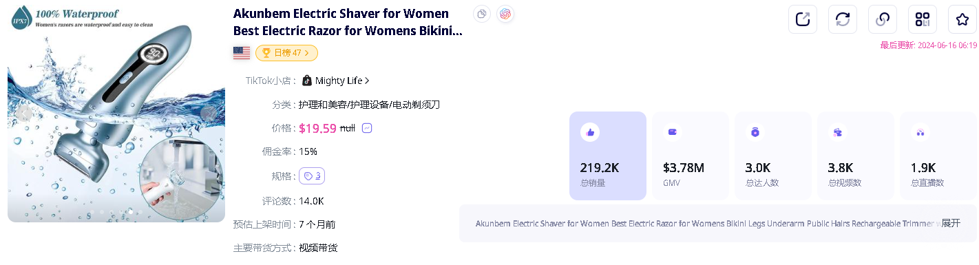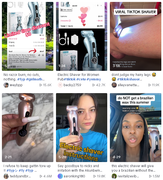 都说高品质的产品是用户喜爱的基础,虽然该款剃须刀产品与 TikTok 上其他同类产品相比,在价格上有一定的优势,凭借亲民的价格,Akunbem 也确实得到了女性用户的大力支持。 但大家都清楚地知道,TikTok 上的女性消费者对产品性能和使用体验要求普遍较高,仅仅依靠低价策略是难以成功出圈的。之所以能在 TikTok 美区持续热销,Akunbem 女士电动剃须刀除了依靠价格优势以外,同样离不开产品本身优异的性能以及良好的用户口碑。 在产品方面,Akunbem 电动剃须刀的优势是其独特的人体工学设计,在深入了解女性用户的需求和痛点的基础上,该款产品专门采用了 3 合 1 高速锋利刀片,可轻松修剪手臂、腿部、腋窝、比基尼等区域的毛发。此外,低噪音可拆卸防水的功能设计、出色的续航性能、适用于敏感肌肤等等,也是该款女式电动剃须刀区别于其他款产品的优势所在。 正因如此,这款以用户需求为着眼点,集齐消费者所关注功能的产品才能吸引消费者注意力,激发购买欲望。