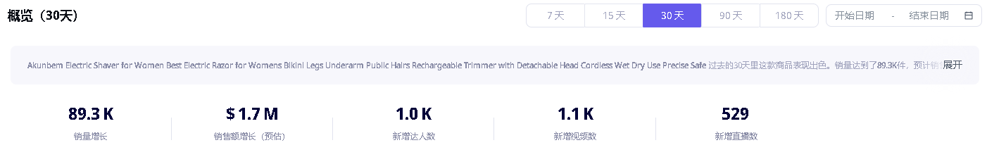 根据 kalodata 平台提供的数据显示,过去 30 天内,该款产品建联了超 600 位达人,借助 KOL 的带动效应,Akunbem 女士电动剃须刀在 TikTok 上快速提升了品牌的曝光度和影响力。同时,Akunbem 鼓励用户自发生产内容,通过用户分享的真实反馈和使用体验,来形成良好的口碑传播效应,增强品牌的可信度和亲和力。