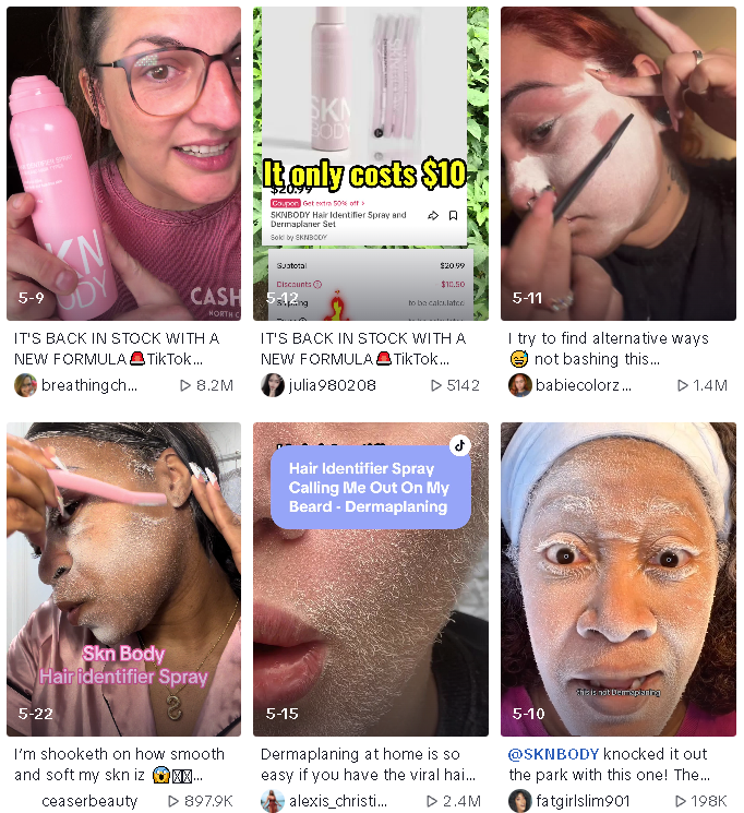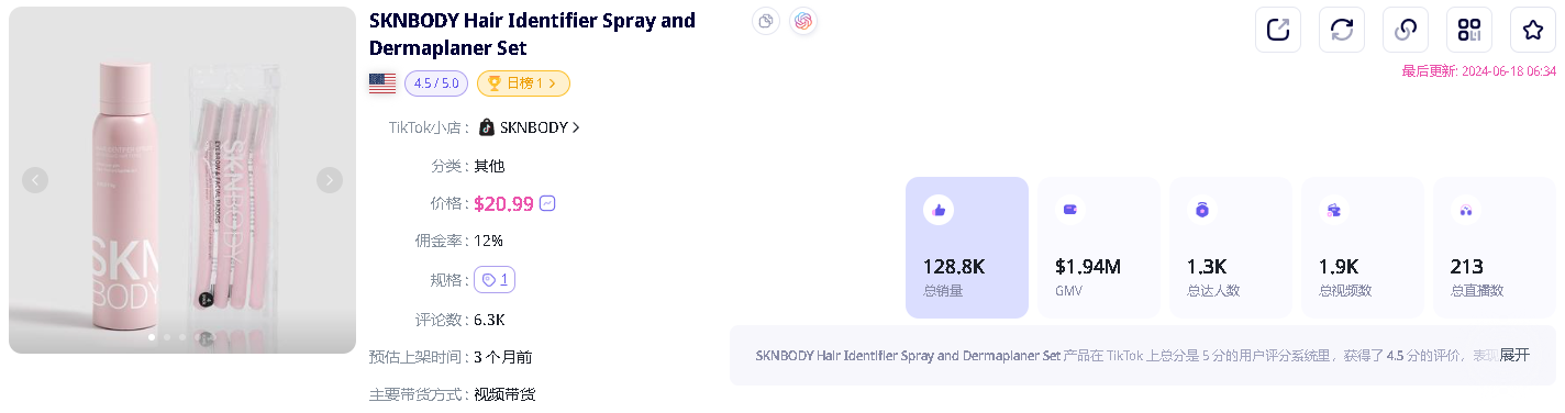 而 SKNBODY 该款女性面部毛发清理套装之所以能在 TikTok 美区实现爆单,与达人带货同样也有非常大的关系。 自商品上架以来,SKNBODY 先后建联了上千位达人,在 TikTok 上,达人们直接用 SKNBODY 的产品来去除脸上的毛发,新奇特的“面部毛发识别喷雾”直接上脸,以及使用前后的对比效果图,给用户带来了极强的视觉冲击力,在观看视频的过程中刺激着他们的购买欲。达人大规模的推广也使得 SKNBODY 迅速成为 TikTok 上的爆款产品。