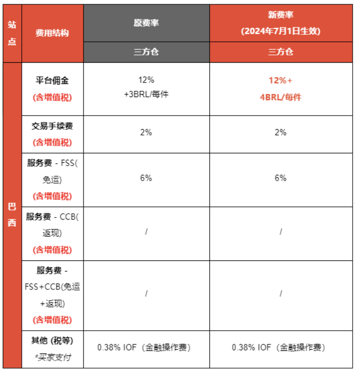 1、2024 年 7 月 1 日(当地时间)起,每件商品佣金加交易手续费上限金额为 100BRL+4BRL(不包含 FSS、CCB 及其它费率)