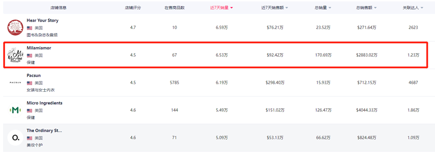 这样庞大的市场,自然带动了许多品牌业绩增长。除了上文提到的Milamiamor,主营蛋白粉的Micro Ingredients也是佼佼者。该品牌主打“高品质”“纯净”“天然”等旗号,力图满足消费者对健康营养的需求,旗下一款“多种胶原蛋白肽粉”成功成为了爆款单品,今年3月时在TikTok Shop上平均日销6000件,一举冲上了全平台销量榜第三。 到了今年6月,Micro Ingredients依然稳居TikTok Shop销量榜前五。Fast Moss提供的数据显示,在最近7天,该品牌的销量高达5.49万,销售额超过了151万美元。截止目前,Micro Ingredients的总销量已经达到了126.47万,总销售额达到了惊人的4044.33万美元。