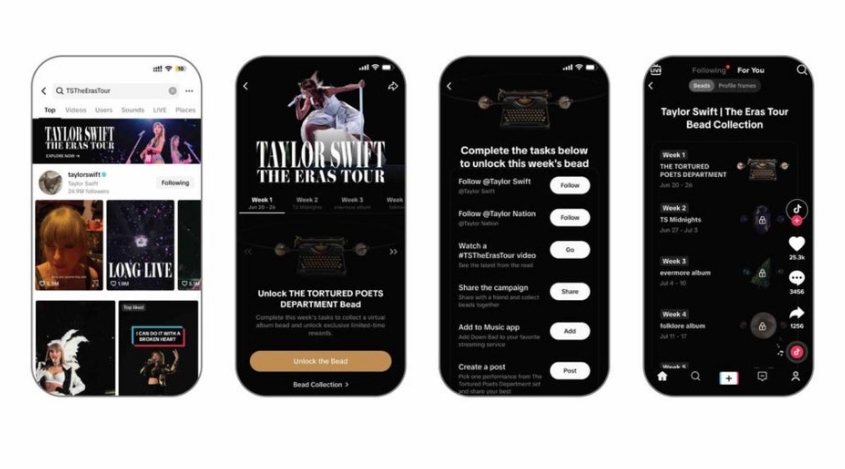 Fans can access the #TSTheErasTour by clicking the anchor alongside Taylor Swift content on TikTok or interacting with the search banners when searching terms like #TSTheErasTour. Digital friendship bracelet beads and profile frame collections can be viewed on the in-app experience homepage, with task achievements appearing as pop-up messages.