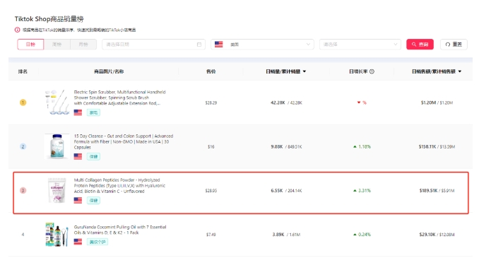 凭借一款“多种胶原蛋白肽粉”,Micro Ingredients一跃成为保健品类的爆款品牌。今年3月,这款产品在TikTok Shop上日均销售量达到6000件,迅速攀升至全平台销量榜第三位。