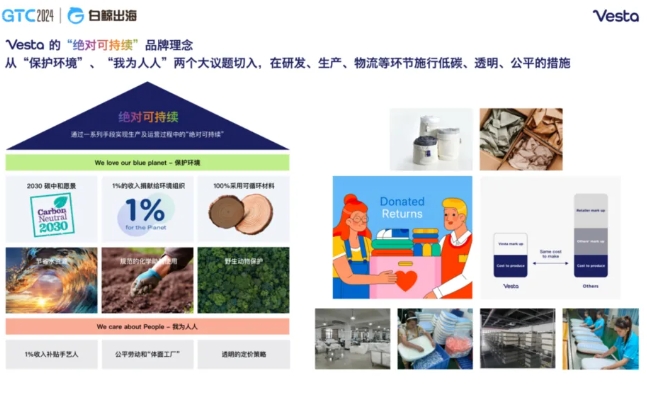 在品牌宣传方面,嘉宾提到了 Vesta 如何利用社交媒体和红人营销来提升品牌知名度。他指出,Vesta 注重海外市场特别是欧美的碳中和概念,如谷歌的环保努力,这符合发达市场的需求。我们选择符合这些标准的工厂进行合作,并借助环保组织如 B Corp 提升品牌形象。