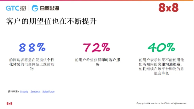 嘉宾首先介绍了 8×8 公司的全球业务布局,并指出了全球电子商务市场的快速增长趋势。他通过一系列数据展示了跨境购物的普及率和消费者对客服的期望。