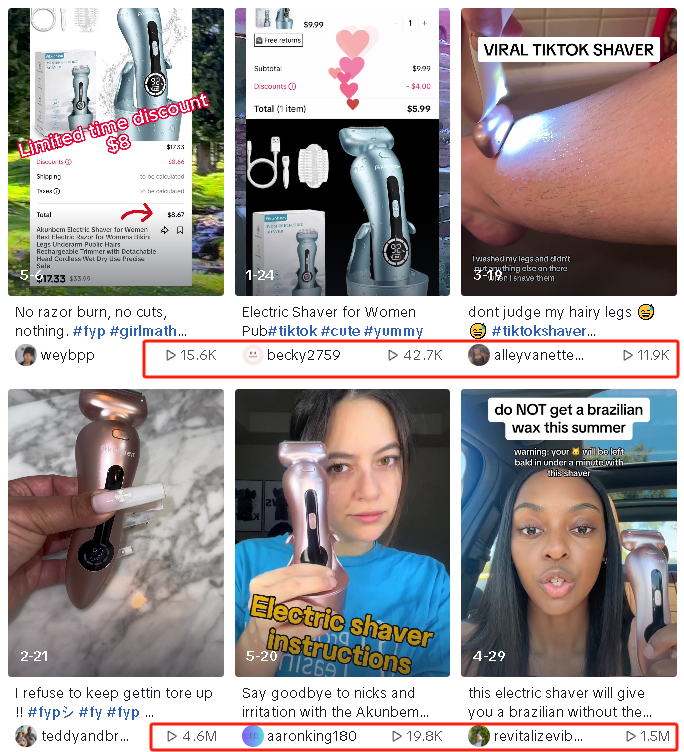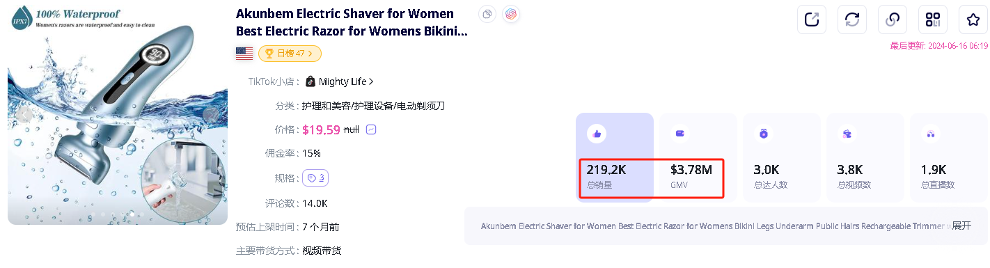 特别是在过去30天内(2024年5月18日至6月16日),Akunbem在TikTok上售出8.93万件产品,销售额超百万美金,给店铺Mighty Life带来了超过90%的收入。 在过去,脱毛产品主要面向男性市场。然而,随着社会观念的转变和女性对个人护理及身体形象的重视,女性脱毛需求日益增长。Akunbem敏锐地捕捉到了这一市场变化,迅速推出针对女性用户的电动剃须刀产品,填补了市场空白,凭借其独特的人体工学设计和优异的产品性能,赢得了消费者的广泛好评。 首先,产品采用了3合1高速锋利刀片,能够轻松修剪手臂、腿部、腋窝、比基尼等区域的毛发,满足女性不同部位的脱毛需求。其次,低噪音、可拆卸防水的设计以及出色的续航性能,让使用过程更加舒适便捷。此外,产品还特别适用于敏感肌肤,为女性用户提供了更贴心的护理体验。