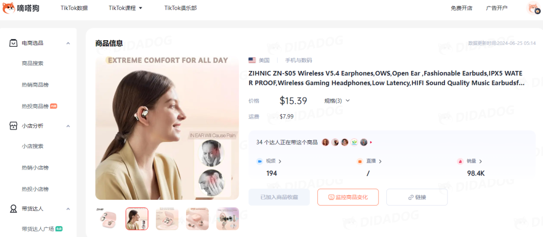 根据嘀嗒狗数据显示,这款产品在3月24日上架TikTok Shop,近30天里,这款产品的日均出货量超1000单,6月1日单日出货量更是高达2100单。所属小店主营各种类型的耳机,本产品作为小店的销量冠军,仅上线三个月便售出超十万单,为小店斩获超百万美金的销售额。 过去30天里有34位达人推广该产品,其中绝大多数达人为膝部达人,平均粉丝量为3.6万。其中粉丝量最高的达人是@aubriaceon,在TikTok拥有近30万的粉丝,累计获赞超1000万,属于美妆个护领域的头部达人。(更多数据可进入嘀嗒狗营销达人广场查看) 通过嘀嗒狗数据可以看到已购用户的评论,目前该产品共计收到11160条评论。评论区购买过的消费者纷纷表示这款耳机佩戴起来没有不适感,并且音质也十分清晰。