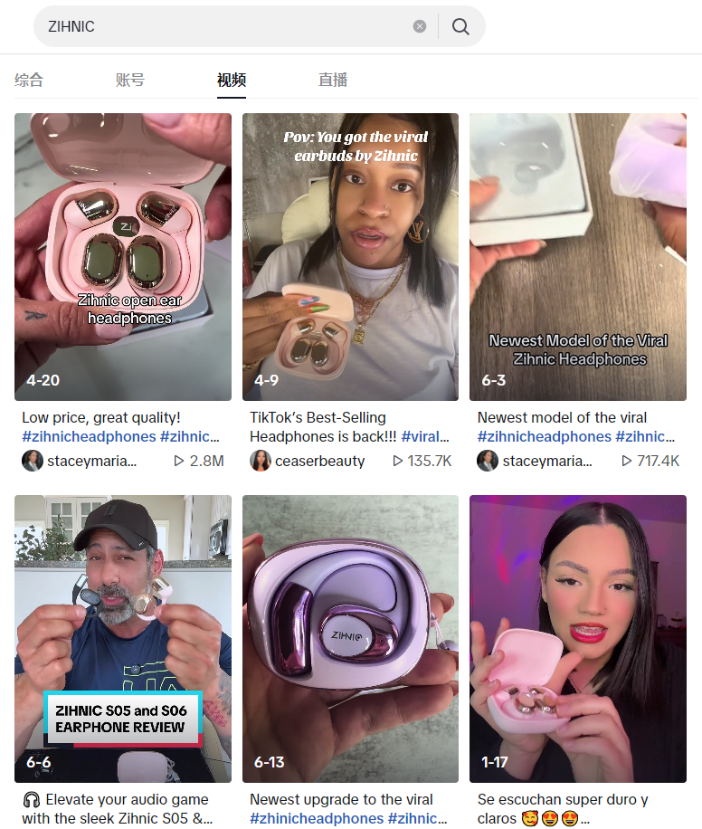 通过搜索商品关键词“ZIHNIC”可以看到相关产品的推广视频。TikTok上关于该产品的视频基本全部为测评类视频,博主会根据自己不同的耳形、使用场景来佩戴这款耳机,力求将最真实的体验传递给观众。