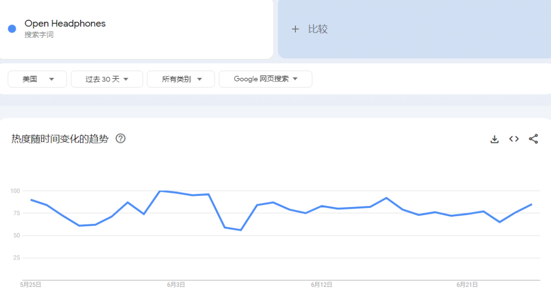 通过Google Trends我们可以了解到一定时期内,产品关键词在搜索引擎上的搜索热度和市场趋势。输入关键词“Open Headphones”可以看到,美国地区过去30天内,对于开放式耳机的搜索热度高且稳定,可以看得出美国市场对于开放式耳机的需求程度居高不下,有充足的市场前景。