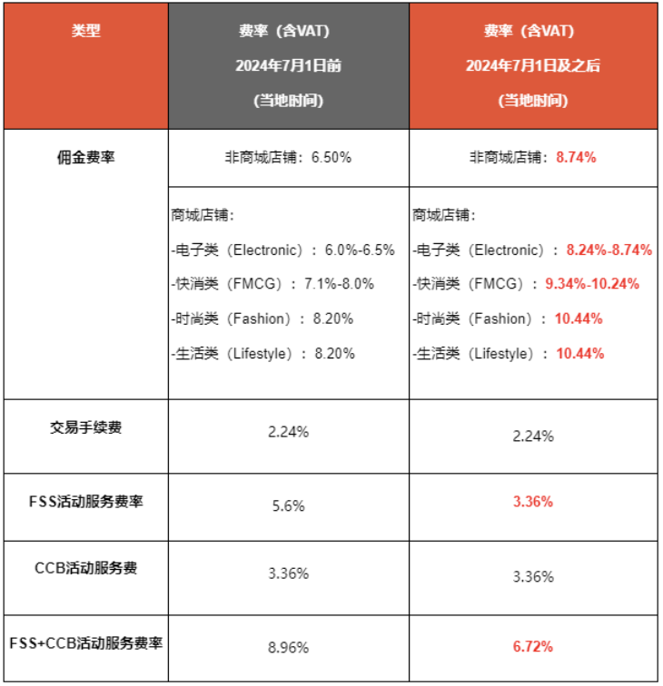 同时为了激励卖家持续优化提升购物体验,平台将进一步扶持参与 FSS(免运活动)的卖家,FSS 活动的服务费率以及 FSS+CCB 的活动服务费率均下调 2.24%。具体如下: