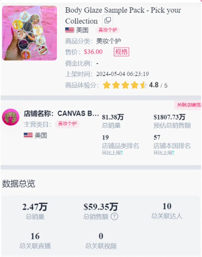 凭借巨大的流量池和大批美妆领域知名达人,美妆个护类目也成为TikTok电商在绝大部分目标市场中最畅销、发展最迅猛的类目。EchiTik的调研结果显示,2023年7月到9月,TikTok美妆个护类目总GMV占到了东南亚市场的22%,美国市场的34%。 当然,TikTok蓬勃发展的美妆个护领域为品牌提供更广阔的增长空间,也孕育出了一系列销售表现亮眼的产品。 以@iamstormisteele个人身体乳品牌Body Glaze为例,该款身体乳尽管不是什么大品牌,但其创始人Stormi却十分善用TikTok营销,目前该品牌的相关标签#bodyglaze在TikTok上的浏览量接近1亿。在@iamstormisteele的直播中,Body Glaze身体乳小样套装单场销量突破了1.2万,目前该产品总销量破2.47万,累计销售额接近60万美元。