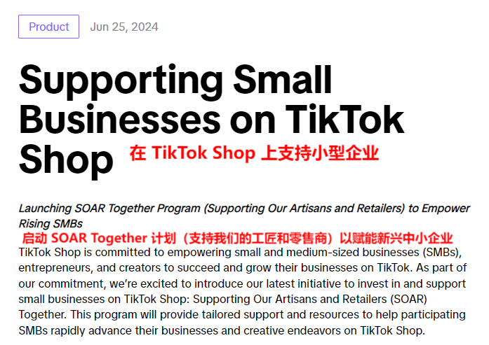 在电商行业的竞争中,一个平台要想发展得更好,除了吸引源源不断的客户,稳定的卖家群体同样是其发展道路上不可或缺的一环。 近日,TikTok Shop针对中小型企业(SMB)、企业家和创作者推出了SOAR Together计划(支持我们的工匠和零售商)。这一计划旨在通过提供量身定制的资源和支持体系,助力参与的中小企业在TikTok Shop上加速推进业务增长和创意实践。
