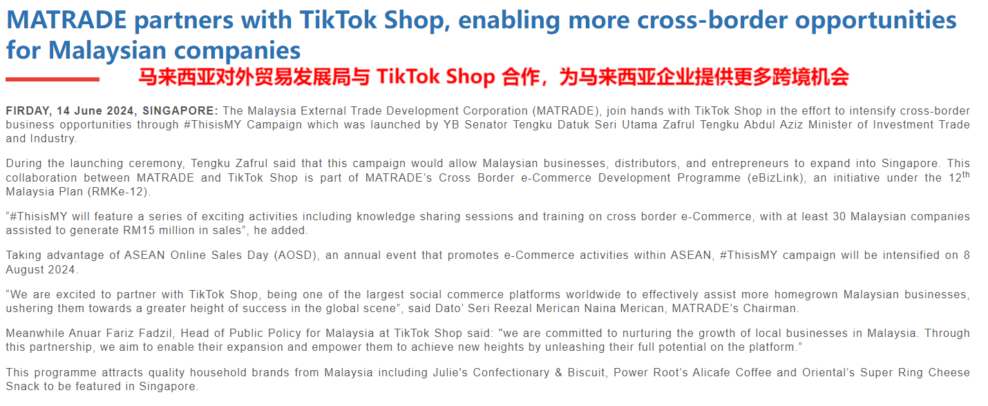 马来西亚对外贸易发展局与TikTok Shop合作 图源:matrade.gov.my