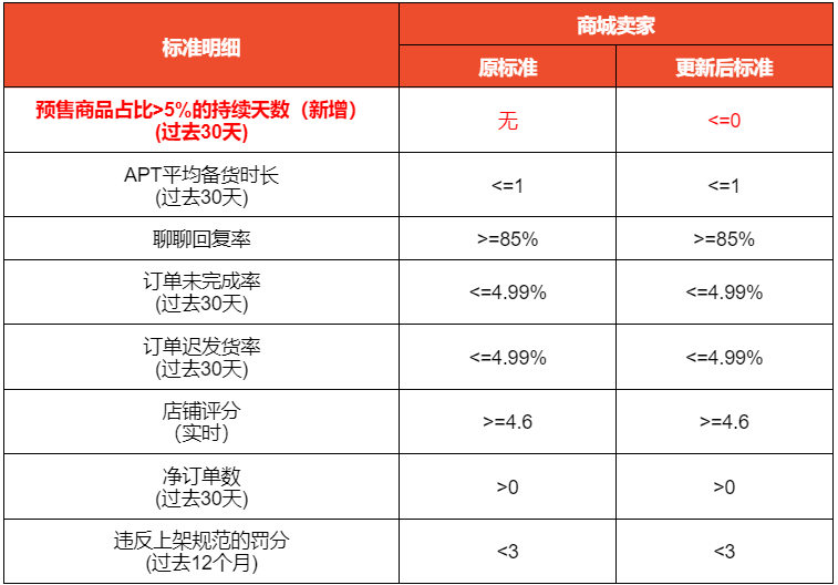 (更新点)预售商品占比要求由<10%更新为<=5%,在此新标准下,卖家预售商品占比>5%的持续天数需<=0。